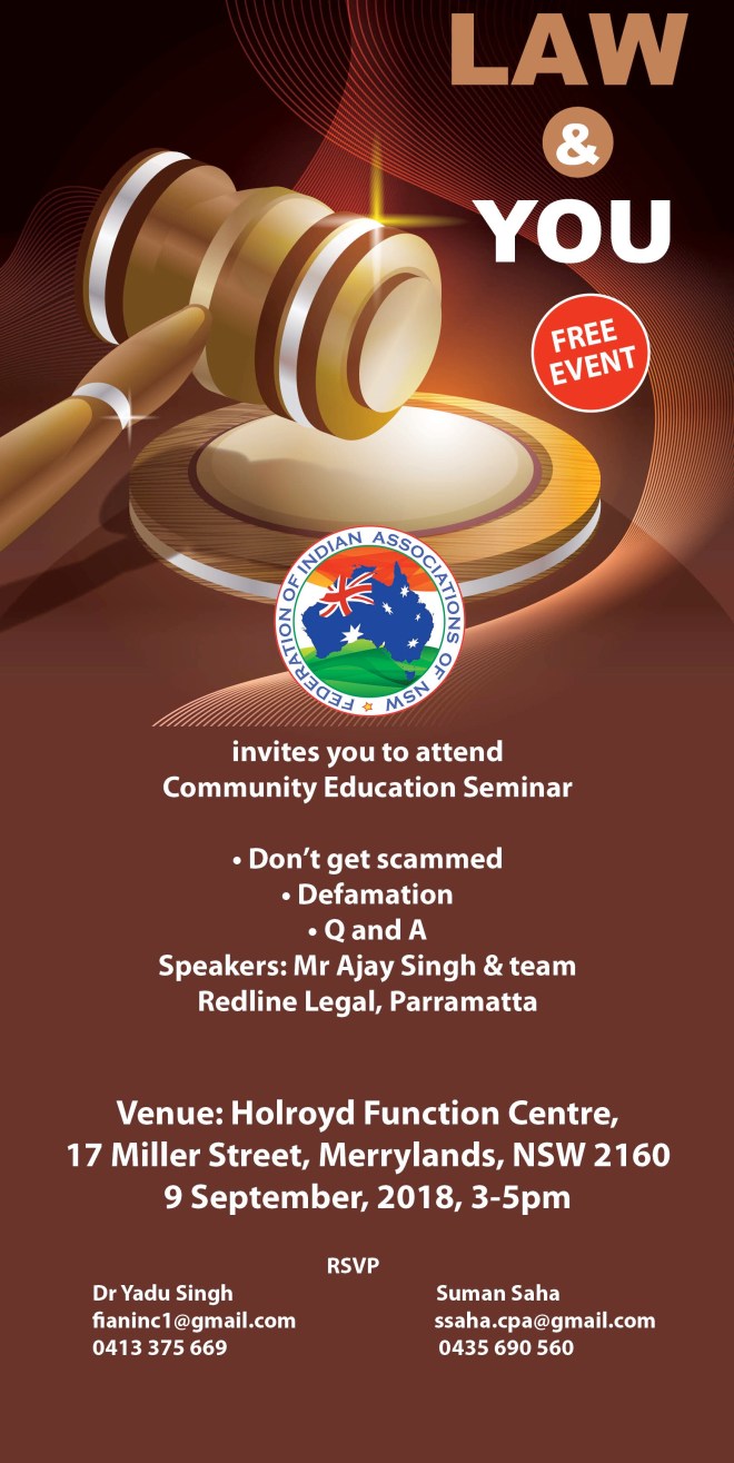 For further information contact Dr Yadu Singh, President, Federation of Indian Associations of NSW on 0413 375 669 or fianinc1@gmail.com